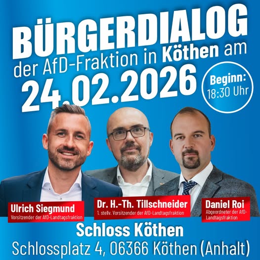 Bürgerdialog mit Ulrich Siegmund MdL, Dr. H.-Th. Tillschneider, MdL und Daniel Roi MdL Veranstaltungszeiten: Einlass: 18:00 Uhr Beginn: 18:30 Uhr Ende: ca. 20:00 Uhr Veranstaltungsort/Objekt: 06366 Köthen (Anhalt), OT Köthen, Schlossplatz 4, Schloss Köthen